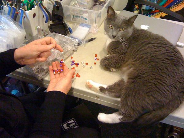 discover she was instead huddling with them at night for warmth, and sharing in their feed. We began feeding her, and sometime later managed to lure her into the house. Cat worked at the bead shop for many years, throwing herself under people’s feet (she preferred older ladies that were more likely to trip on her) to collect pats.