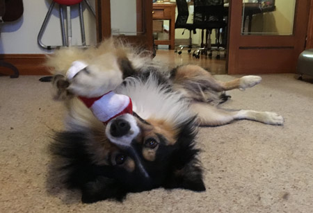 warehouse pup (in between naps), but will be about from time to time to keep an eye on things! Sprinkles is busy keeping 14yo Pavlova the Border Collie on her toes when racing around home.
